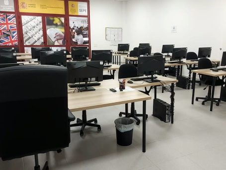 Aulas equipadas con ordenadores y recursos digitales, ideales para cursos administrativos, de ofimática, idiomas, competencias digitales y otras formaciones teóricas que requieran uso de equipos informáticos.